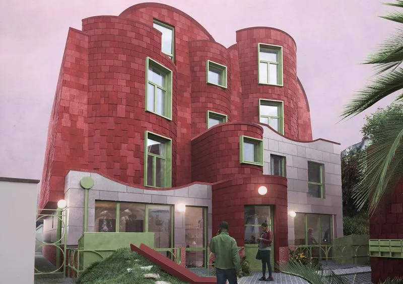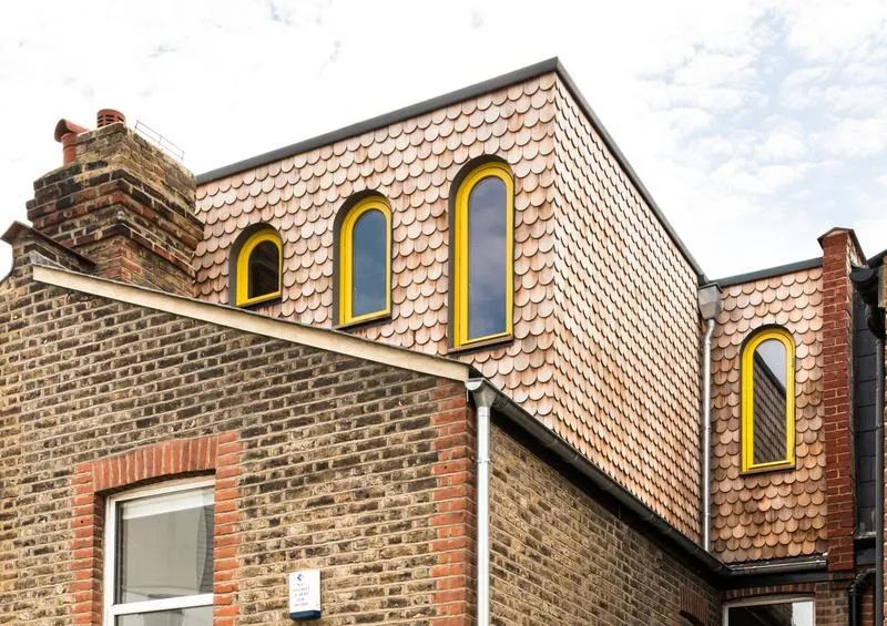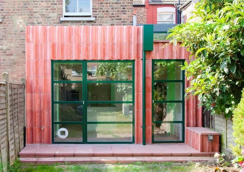 A Victorian house in north London is transformed into a bright and generous family home with glazed pink pillow shaped tiles which drape the exterior.